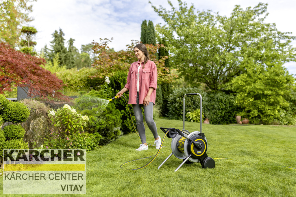 A mobil és strapabíró tömlőkocsi robusztus fém tömlőtekercsel, rendkívül széles talppal, precíz tömlővezetővel és állítható magasságú fogantyúval.