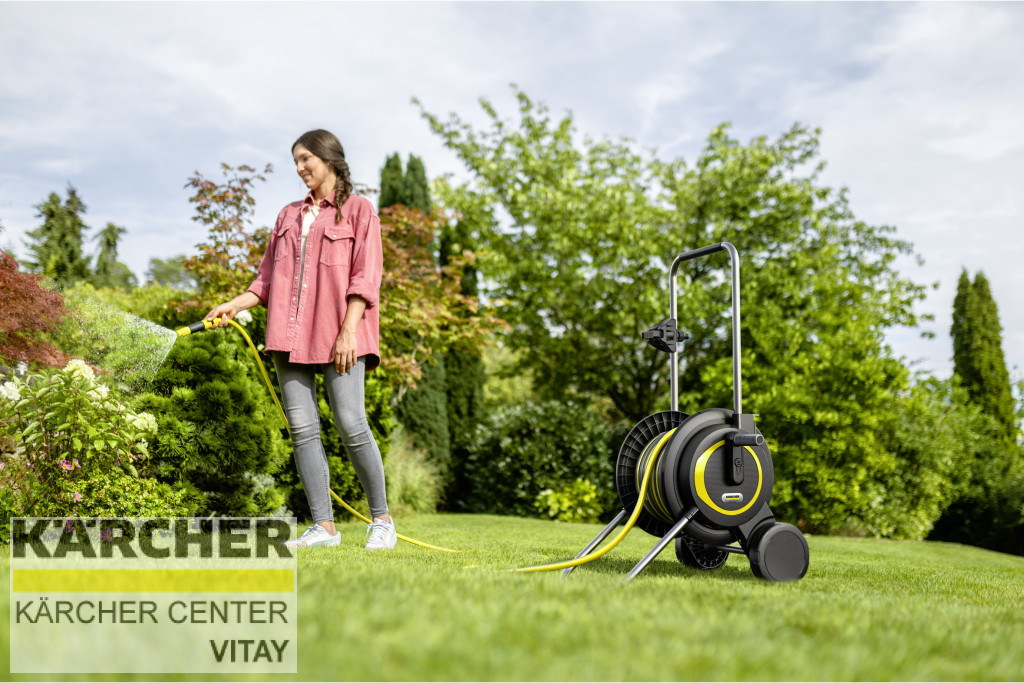 Fúvókatartóval ellátott tömlőkocsi a maximális stabilitást biztosító extra széles talpával, állítható magasságú fogantyújával, 20 m-es kerti tömlőjével és öntözőtartozékaival.