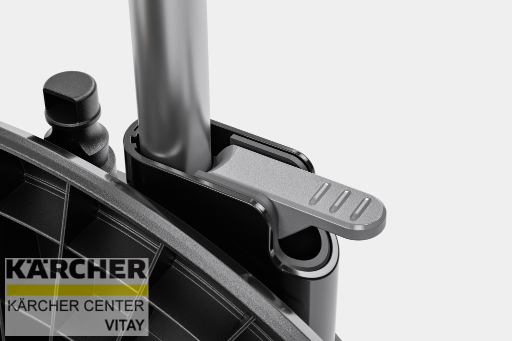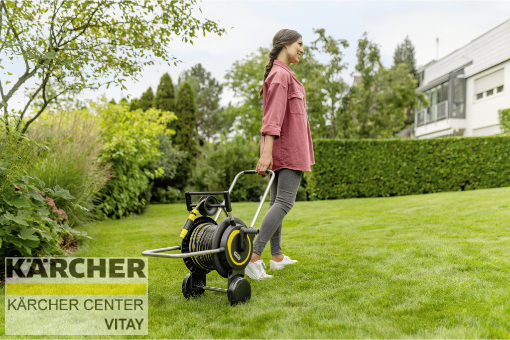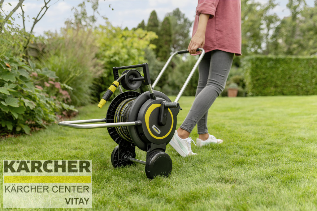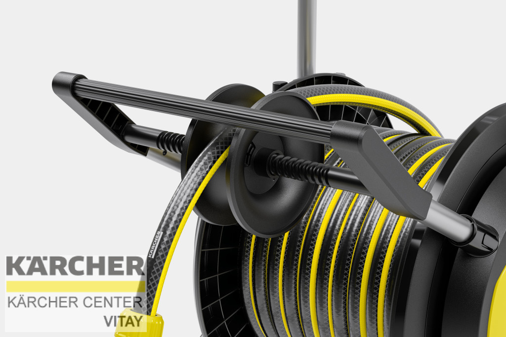 A mobil tömlőkocsi készlet rendkívül széles alappal, precíz tömlővezetővel és állítható magasságú fogantyújával tűnik ki, és 20 m tömlővel és tartozékokkal együtt azonnali használatra kész.
